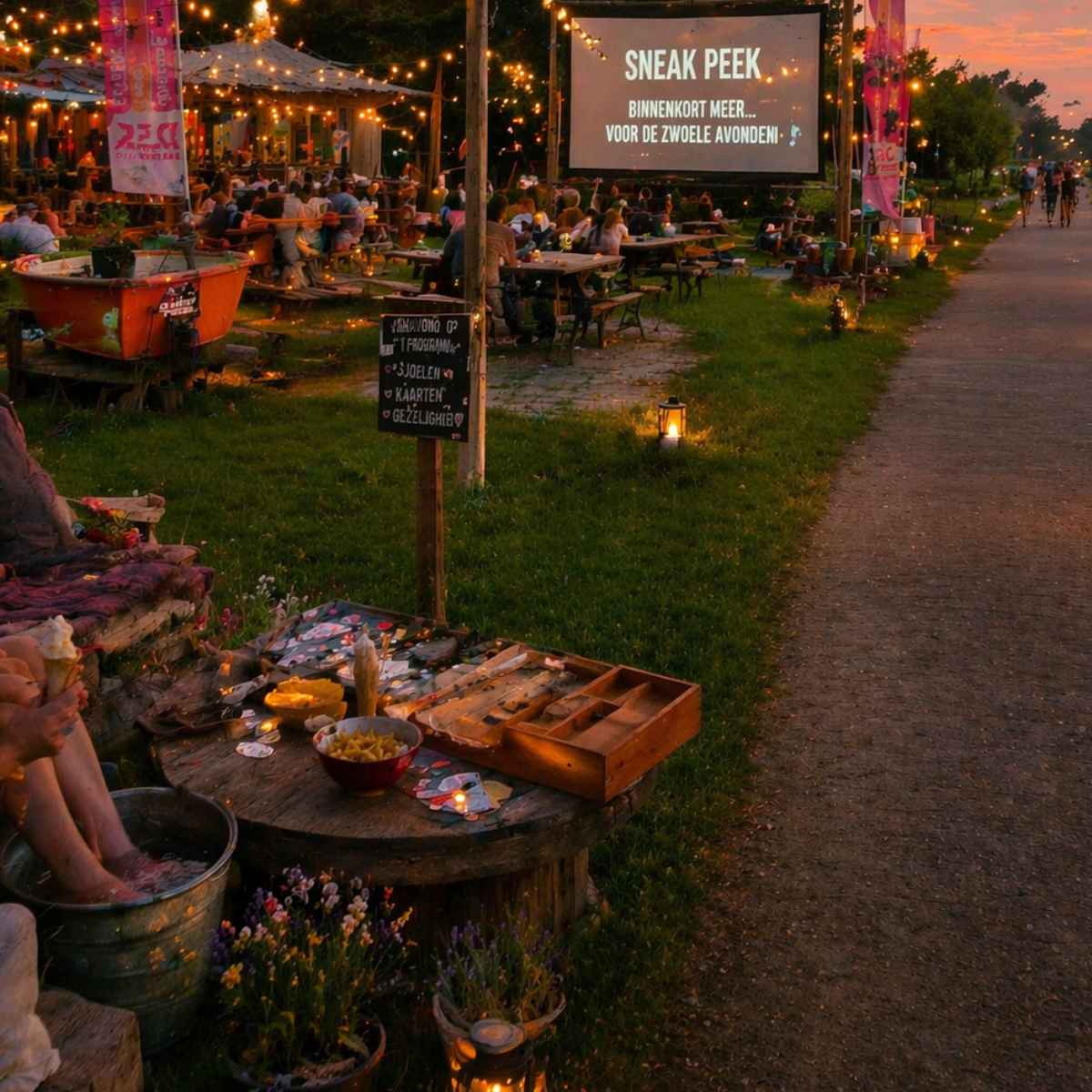 Schoenen uit, voetjes in het water voor verkoeling (vanaf 23°C)